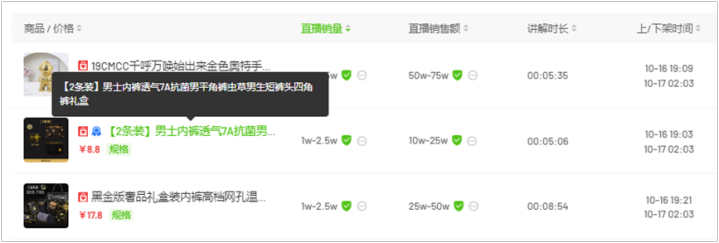 飞瓜数据显示,10月16日19点到10月17日凌晨2点的一场直播,五分钟的讲解,8.8元两条的虫草内裤卖出了10-25万的销售额。